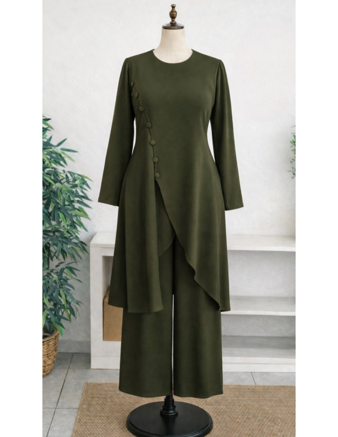 Succombez au charme de cet ensemble composé d’une tunique longue avec fente et faux boutons, accompagné d’un pantalon large à taille élastique. Une tenue pensée pour allier raffinement, fluidité et confort au quotidien.