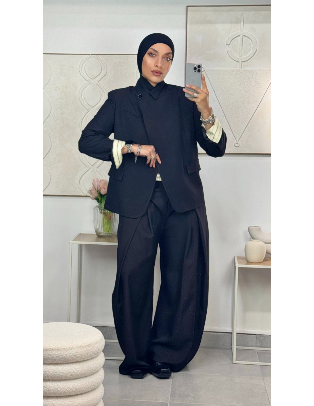 Parfait avec un pantalon à pinces pour un look professionnel impeccable, ou porté sur une robe fluide pour un contraste moderne et féminin. Idéal au bureau, en rendez-vous ou pour une tenue sophistiquée au quotidien.